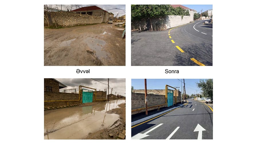 Əsas və məhəllə yollarına, həmçinin, yaşayış evlərinin qarşısına 17145 kv metr asfalt vurulub. Bundan əlavə, qeyd olunan ünvanda sakinlərin rahat və təhlükəsiz hərəkətini təmin etmək məqsədilə uzunluğu 2000 metr olan piyada səkiləri tikilib. Əlavə olaraq yağış sularının kənarlaşdırılması məqsədilə uzunluğu 2100 metr olan boru çəkilərək, 55 yağış barmaqlığı quraşdırılıb və 450 kub metr həcmdə 3 beton rezervuar qoyulub.