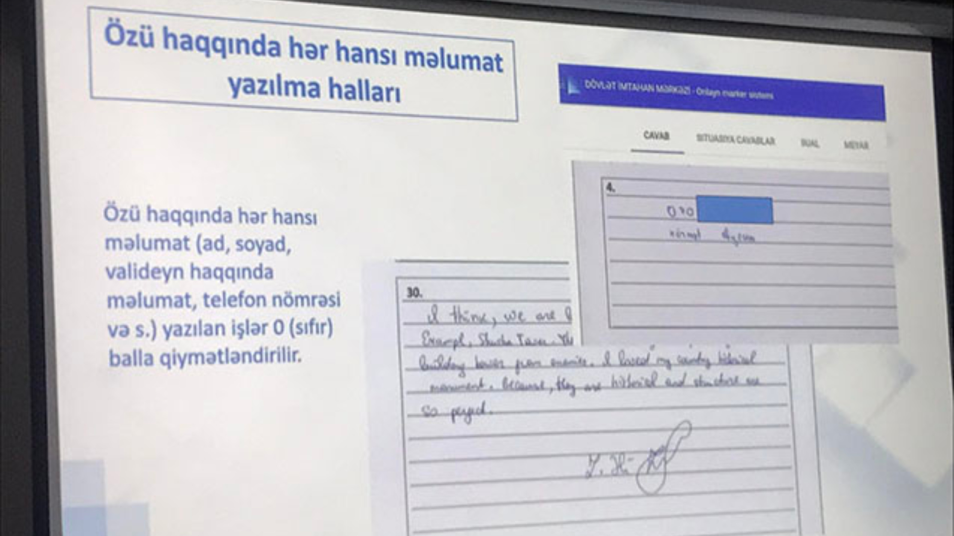 Belə ki, abituriyent yazılı cavab tələb edən tapşırıqlardan birinin cavab bölməsində cavab əvəzinə öz əlaqə nömrəsini yazıb.