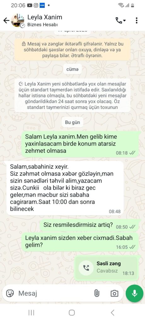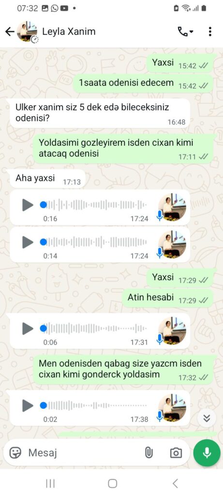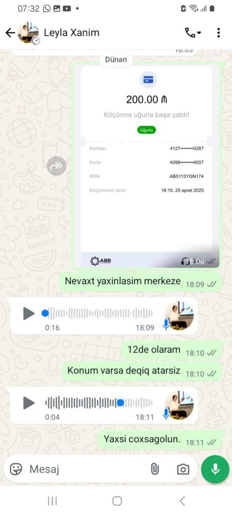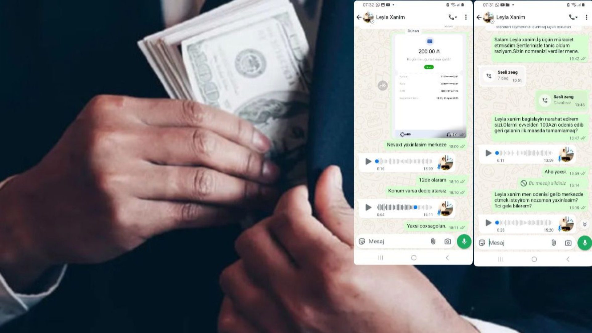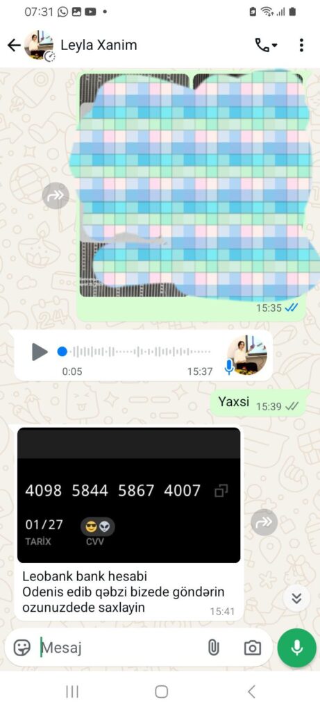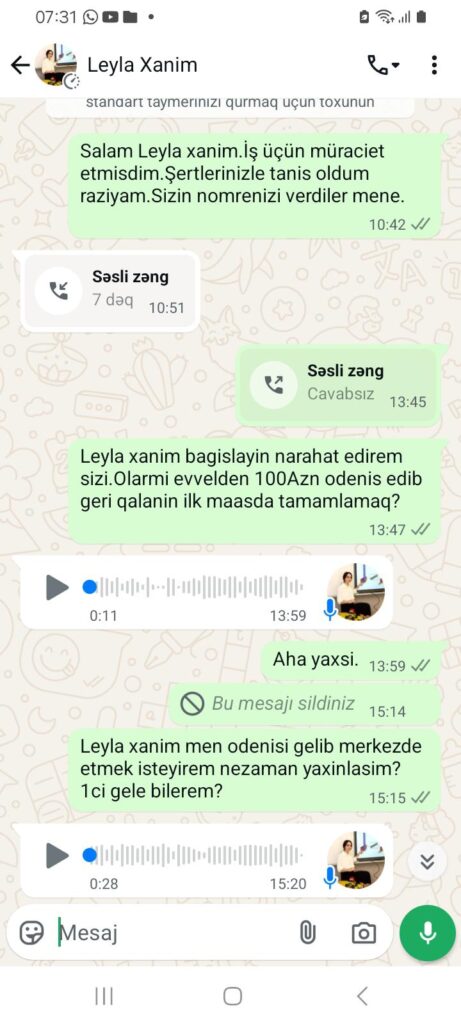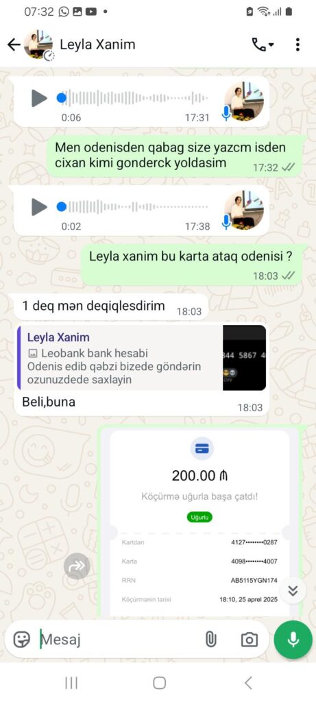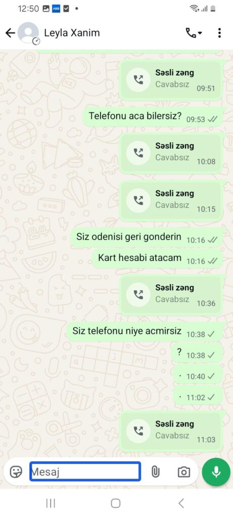 “Hər şeyi çox professional şəkildə edirlər deyə başa düşmək olmur. Mənimlə 3 xanım danışdı. İş şərtləri ilə tanış olduqdan sonra onlarla razılaşdım. Mənə “whatsapp”da əvvəlcə ilkin ödəniş etməli olduğumu dedilər. Buna görə göndərilən karta 200 manat atdım. Tək mən deyiləm. Bir neçə nəfəri də belə aldadıblar. Tanışımdan 400 manat alıblar. Daha sonra ortalıqdan yoxa çıxdılar”.