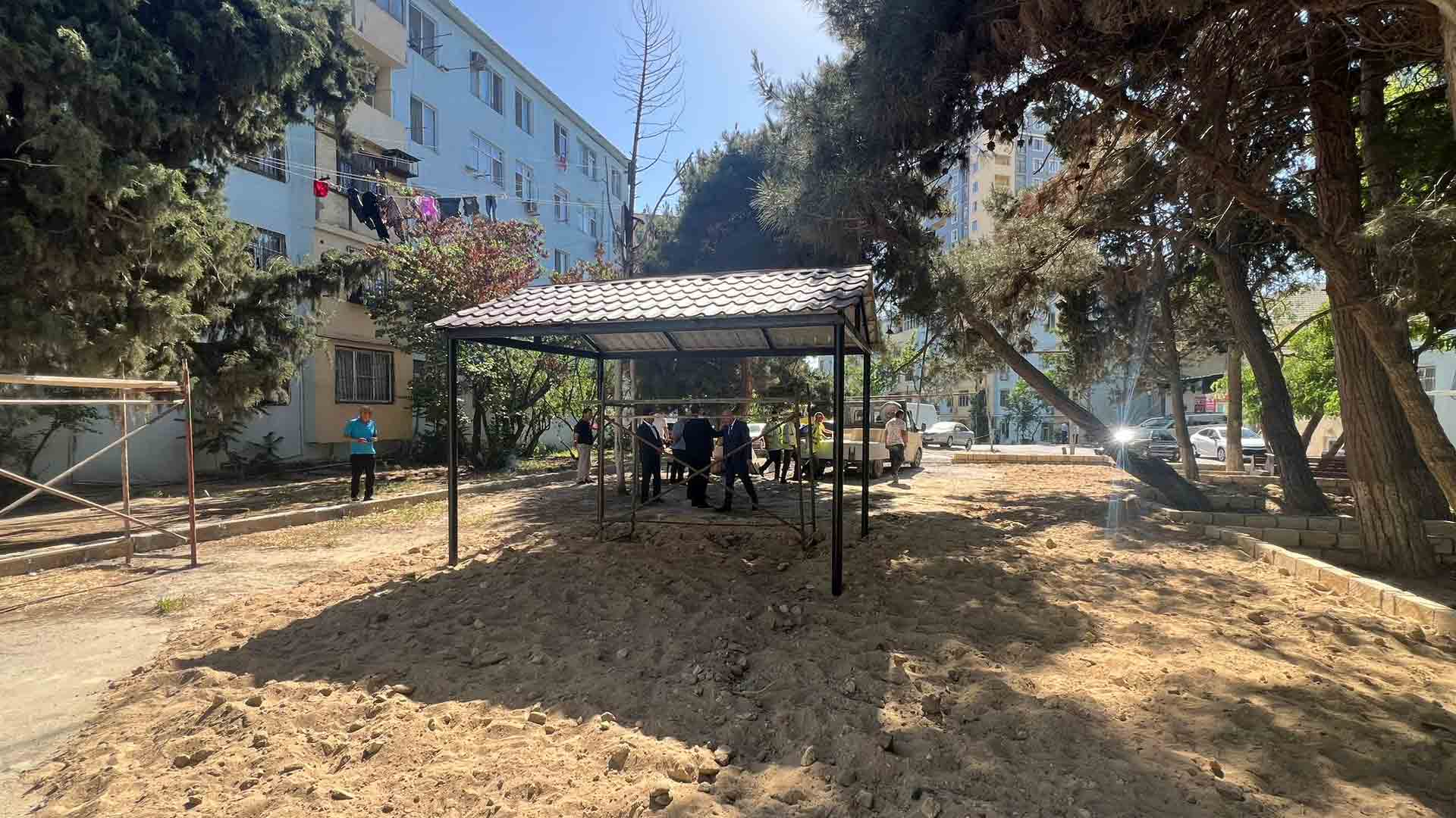 Hazırda həyətdə tamet, bordür daşları vurulur, istinad divarları hörülür və torpaq işləri görülür.