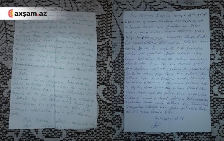 "Əlisahib Hüseynov, Elianora Əhmədova və digər şəxslər birləşərək müxtəlif yalan vədlər verməklə atamı borca saldılar. Bu adamlardan hüquq-mühafizə orqanlarına şikayət etmişik. Obyektiv araşdırılma tələb edirik”.