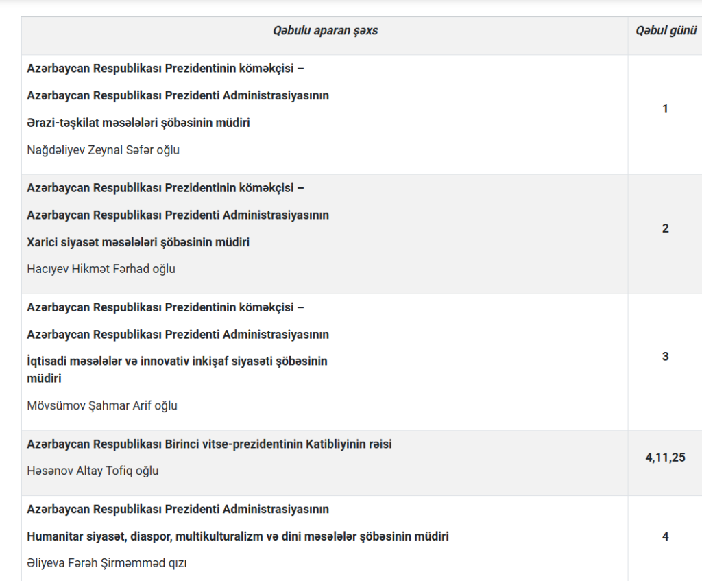 Azərbaycan Respublikası Prezidenti Administrasiyasının Vətəndaş Qəbulu Mərkəzində 2025-ci ilin aprel ayında vətəndaşların qəbul cədvəli açıqlanıb.