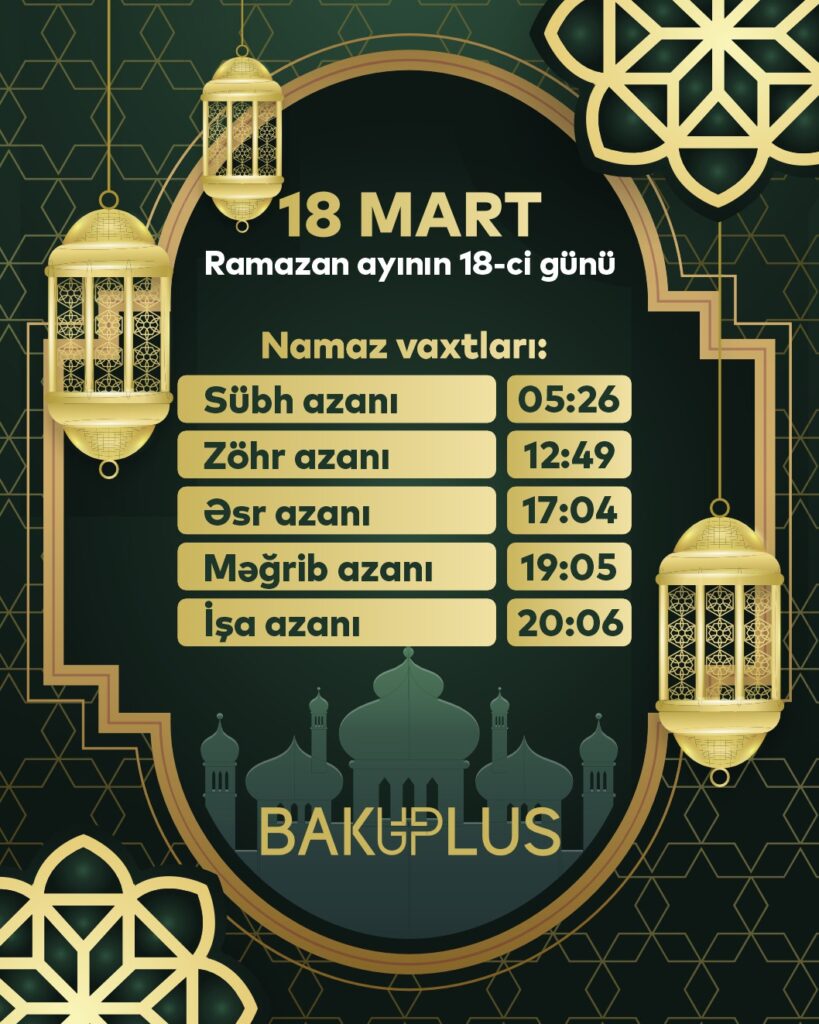 Qafqaz Müsəlmanları İdarəsinin açıqladığı Ramazan təqviminə əsasən, martın 18-i üçün namaz vaxtları: