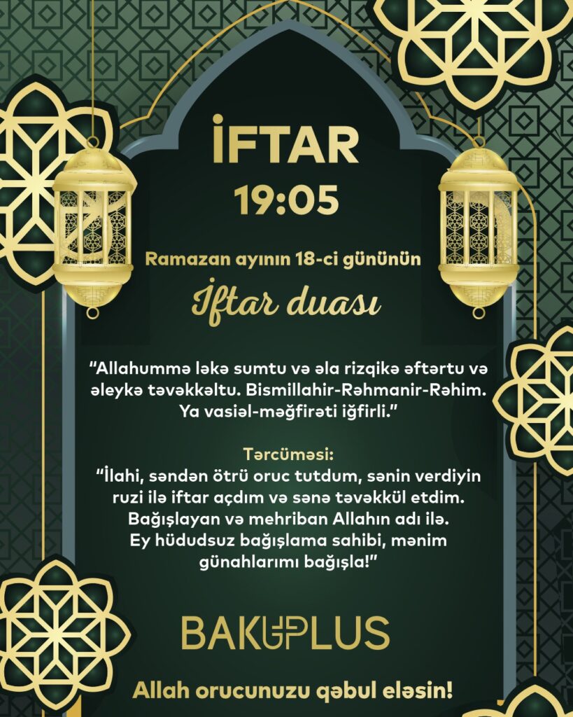 “İlahi, səndən ötrü oruc tutdum, sənin verdiyin ruzi ilə iftar açdım və sənə təvəkkül etdim. Bağışlayan və mehriban Allahın adı ilə. Ey hüdudsuz bağışlama sahibi, mənim günahlarımı bağışla!”