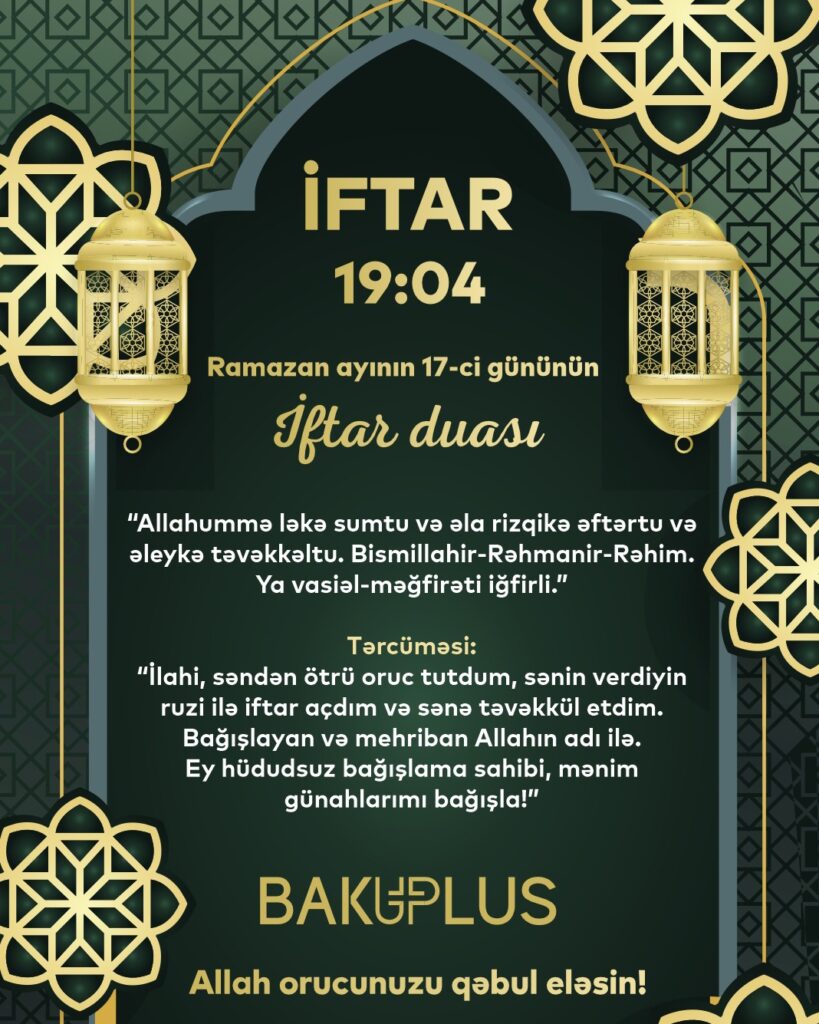 “İlahi, səndən ötrü oruc tutdum, sənin verdiyin ruzi ilə iftar açdım və sənə təvəkkül etdim. Bağışlayan və mehriban Allahın adı ilə. Ey hüdudsuz bağışlama sahibi, mənim günahlarımı bağışla!”