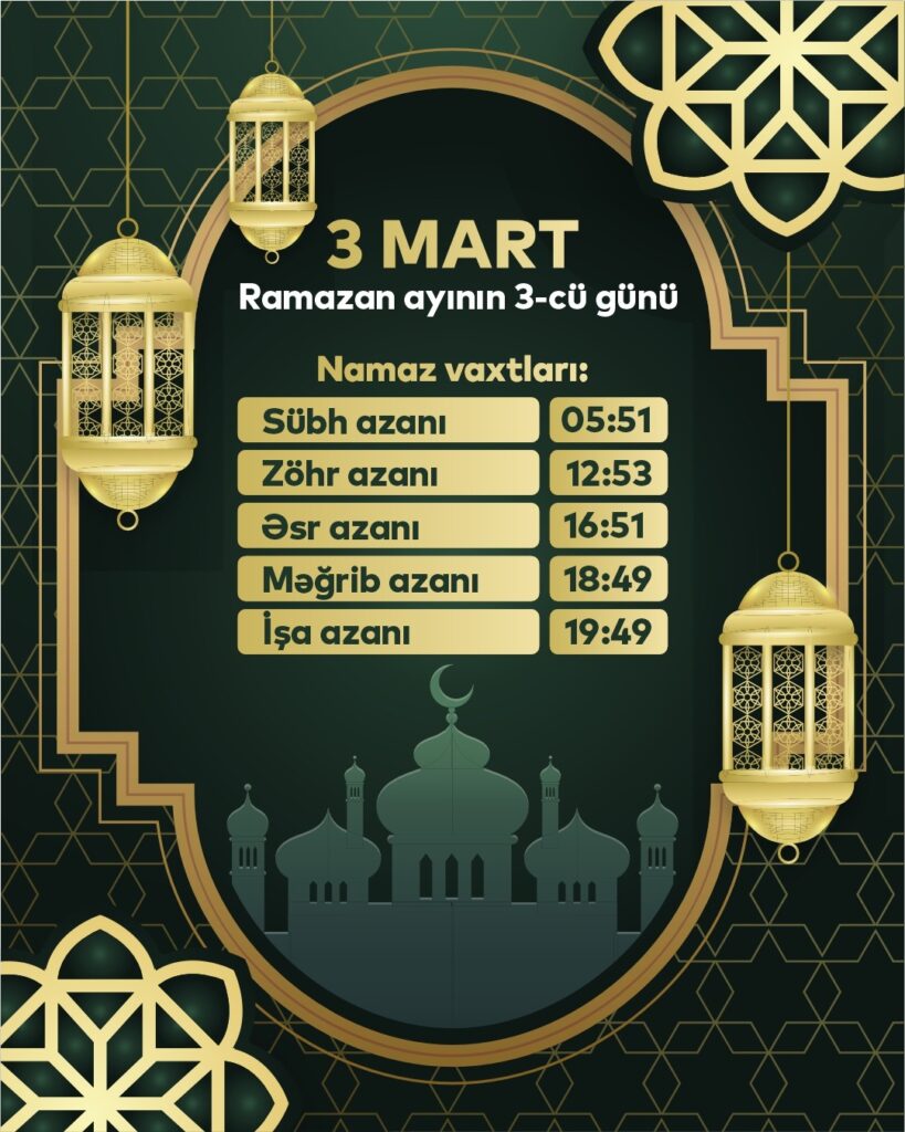 Qafqaz Müsəlmanları İdarəsinin açıqladığı Ramazan təqviminə əsasən, martın 3-ü üçün namaz vaxtları:
