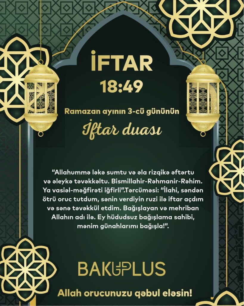 “İlahi, səndən ötrü oruc tutdum, sənin verdiyin ruzi ilə iftar açdım və sənə təvəkkül etdim. Bağışlayan və mehriban Allahın adı ilə. Ey hüdudsuz bağışlama sahibi, mənim günahlarımı bağışla!”