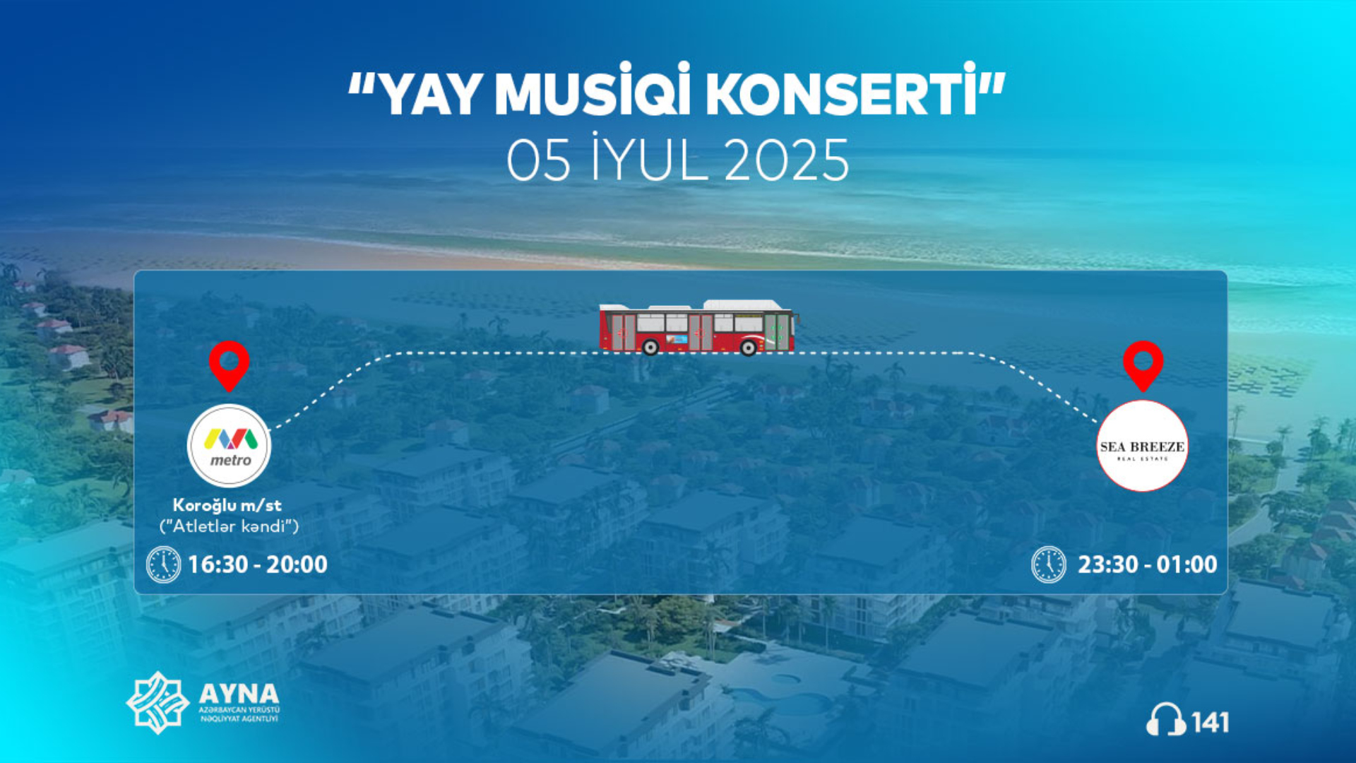 İyulun 5-də “Sea Breeze”də baş tutacaq “Yay musiqi konserti”ndə iştirak etmək istəyənlərin rahat və təhlükəsiz gediş-gəlişini təmin etmək, yollarda yarana biləcək sıxlığın qarşısını almaq məqsədilə Azərbaycan Yerüstü Nəqliyyat Agentliyi (AYNA) tərəfindən xüsusi avtobuslar ayrılıb.