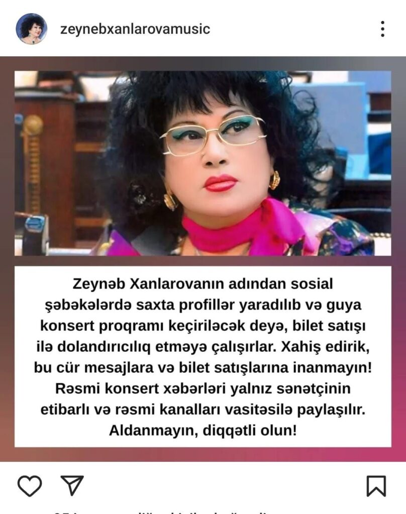 Xalq artisti Zeynəb Xanlarovanın adından sosial şəbəkələrdə saxta hesablar yaradılmaqla dələduzluq edilir. Belə ki, həmin səhifələrdə guya müğənninin konsert verəcəyi bildirilir və bu adla saxta bilet satışı həyata keçirilir.