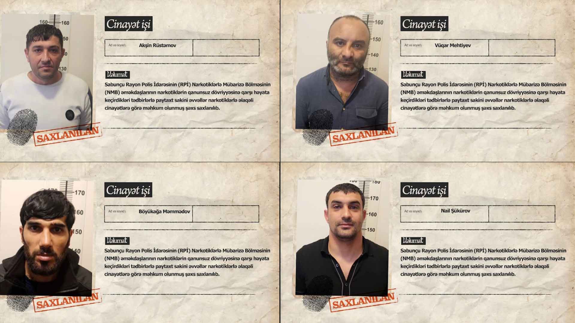 Keçirilən əməliyyat zamanı əvvəllər narkotiklərlə əlaqəli cinayətlərə görə məhkum olunmuş Akşin Rüstəmov, Vüqar Mehtiyev, Böyükağa Məmmədov və Nail Şükürov saxlanılıblar. Onlarda 7 kiloqram heroin, marixuana və metamfetamin aşkarlanıb.