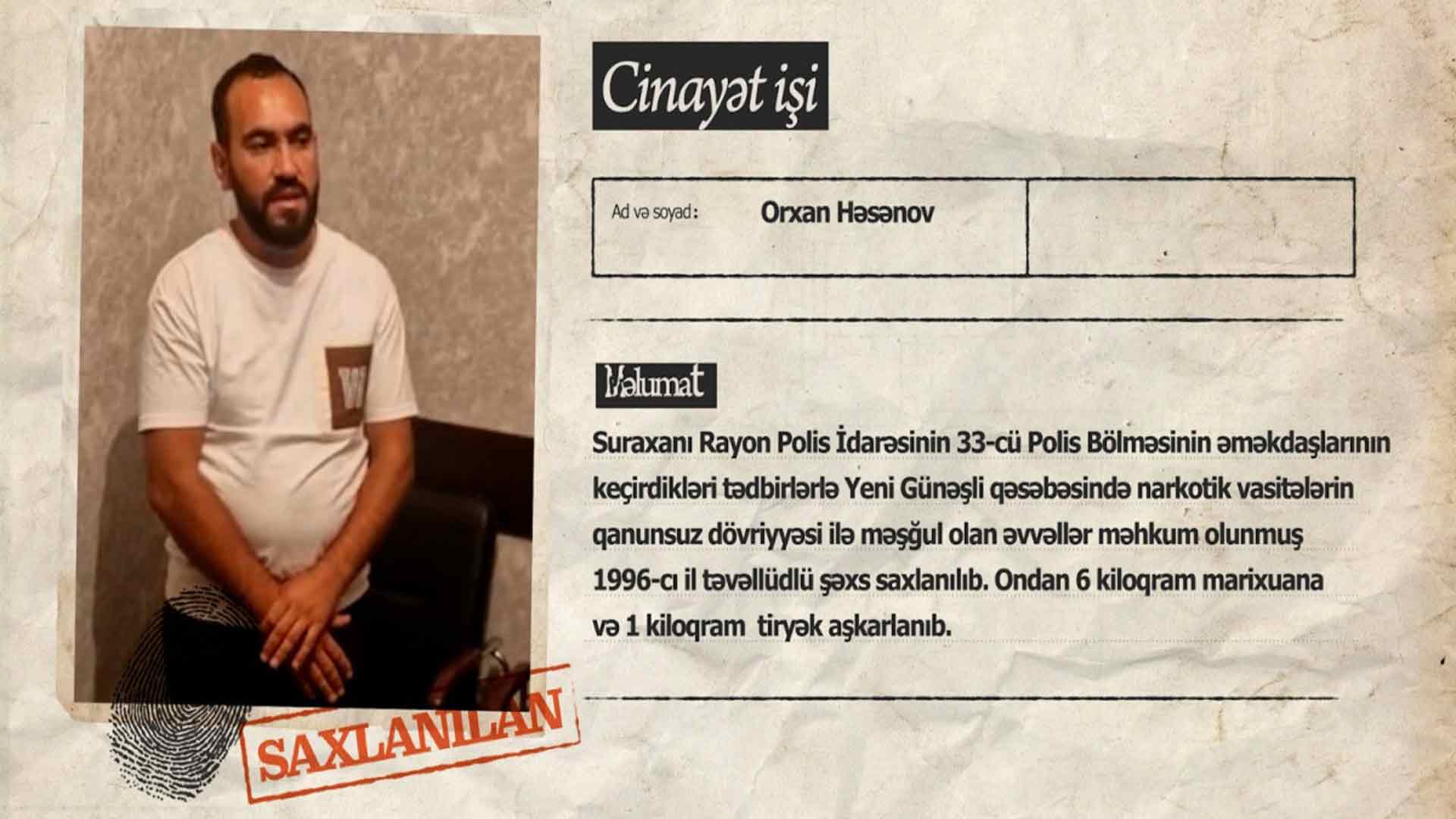 Adıçəkilən rayonun Yeni Günəşli qəsəbəsində keçirilən əməliyyat zamanı əvvəllər məhkum olunmuş 28 yaşlı Orxan Həsənov saxlanılıb. Onda 6 kiloqram marixuana və 1 kiloqram tiryək aşkarlanıb.