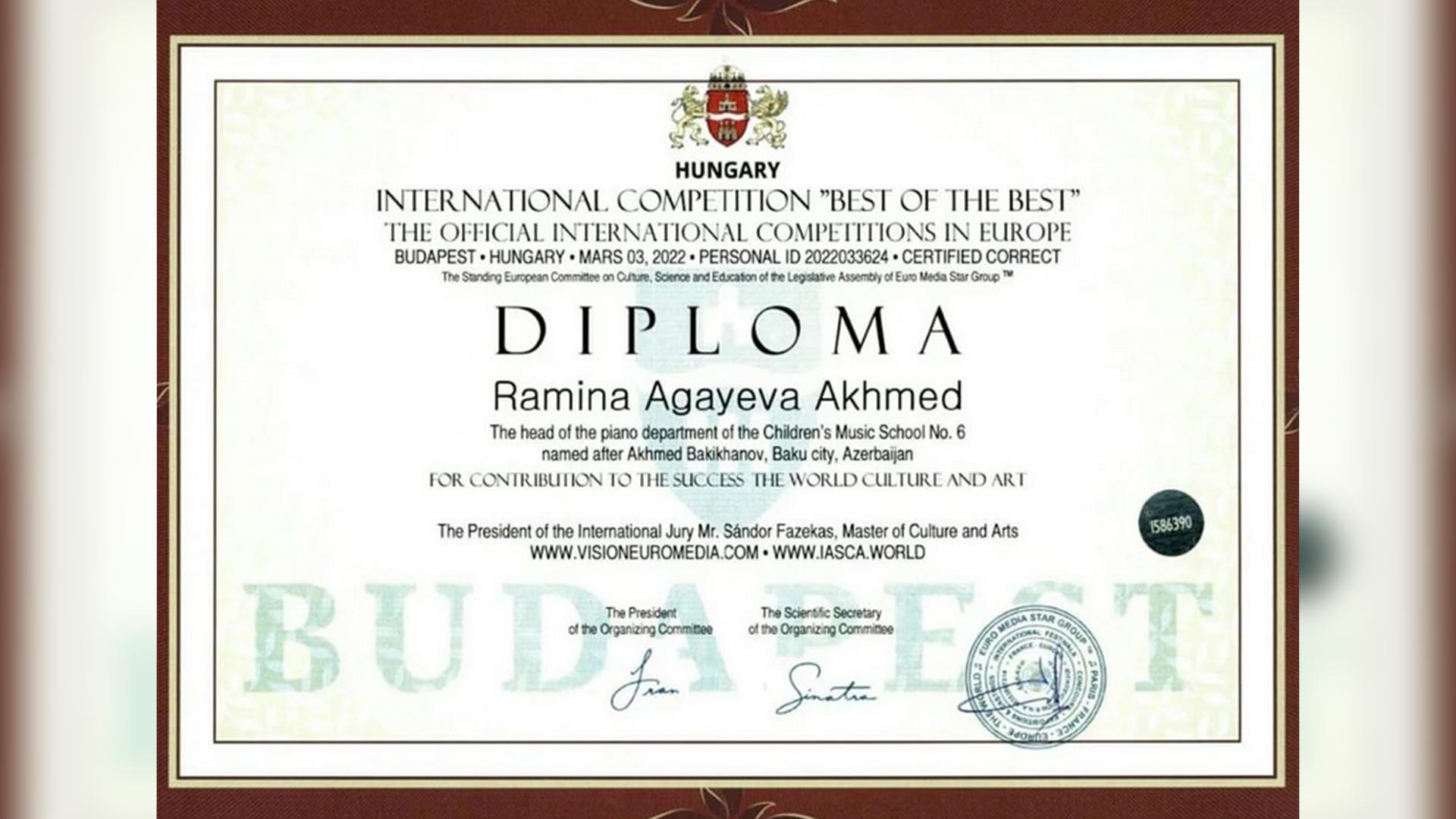 Əhməd Bakıxanov adına 6 nömrəli uşaq musiqi məktəbinin fortepiano ixtisası üzrə I sinif şagirdi Ameliya Əliyeva Macarıstanda təşkil olunan "Best of the best" beynəlxalq müsabiqəsində iştirak edib. Ameliya müsabiqədə gənc pianoçu P.Wedgwoodun "Rush hour dash" əsərini məharətlə ifa edib. O, münsiflər heyətinin qərarı ilə "Diplom"la mükafatlandırılıb.