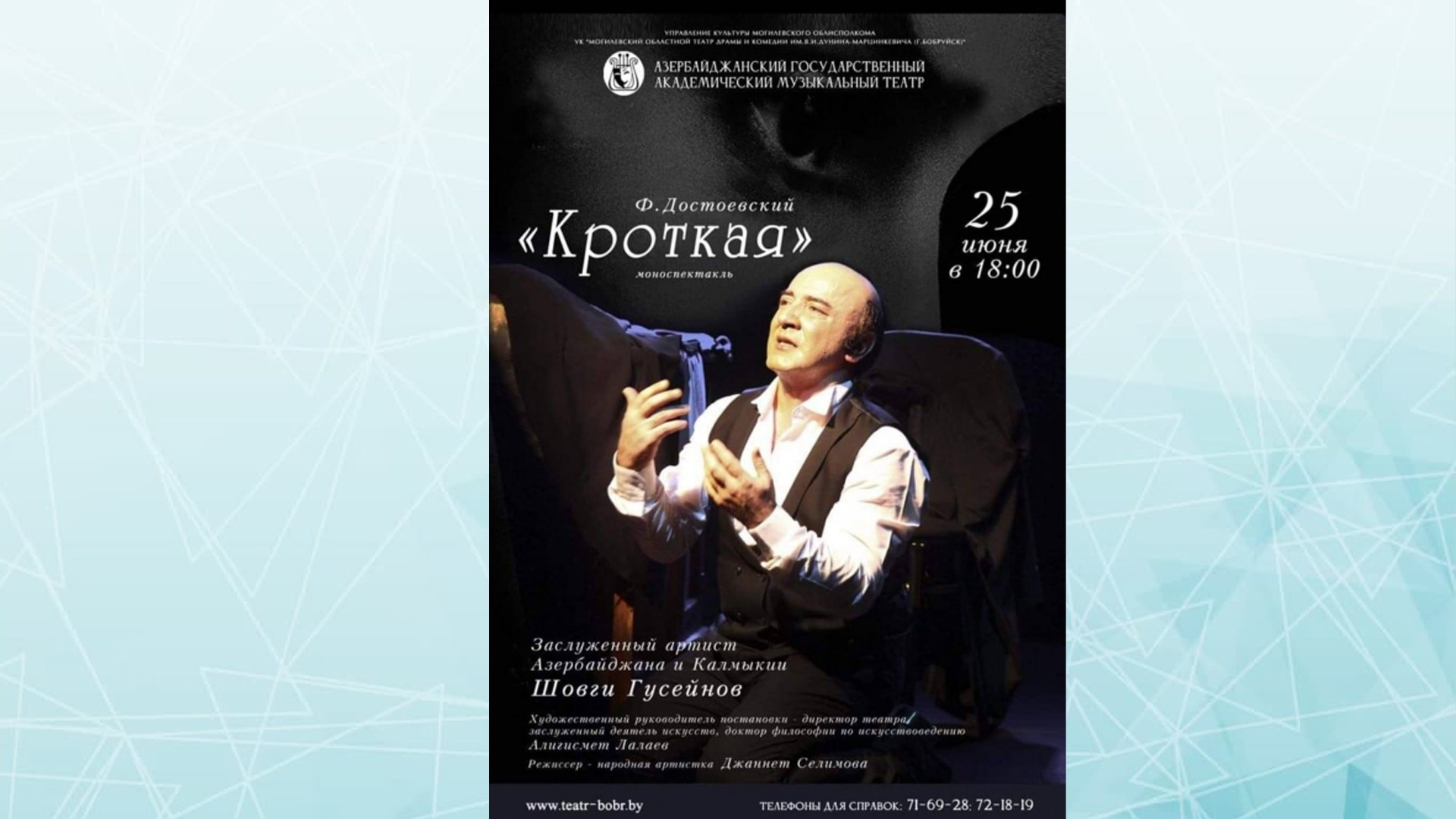 Belarus Respublikasının Bobruysk şəhərində iyunun 23-27-də “Dostluq çələngi” Beynəlxalq Teatr Festivalı keçiriləcək. Festivala dünyanın müxtəlif ölkələrinin nüfuzlu teatrları qatılacaq. Ölkəmizi Azərbaycan Dövlət Akademik Musiqili Teatrı Fyodr Dostoyevskinin “Utancaq qız” monotamaşası ilə təmsil edəcək. Tamaşanın quruluşçu rejissoru, Xalq artisti Cənnət Səlimovadır və əsərin yeganə qəhrəmanı Şövqi Hüseynovdur.