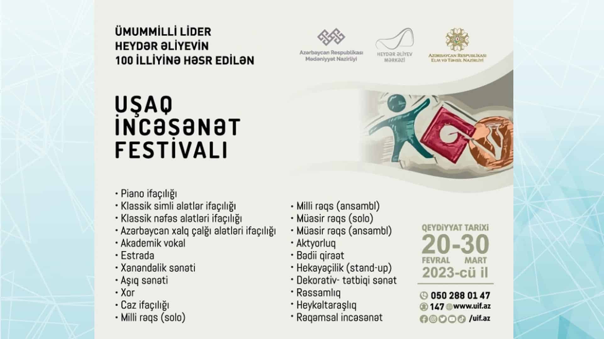Ümummilli lider Heydər Əliyevin 100 illik yubileyinə həsr edilən Birinci Uşaq İncəsənət Festivalı keçiriləcək. Bu haqda bu gün, 22 fevral tarixində Azərtac məlumat verib.