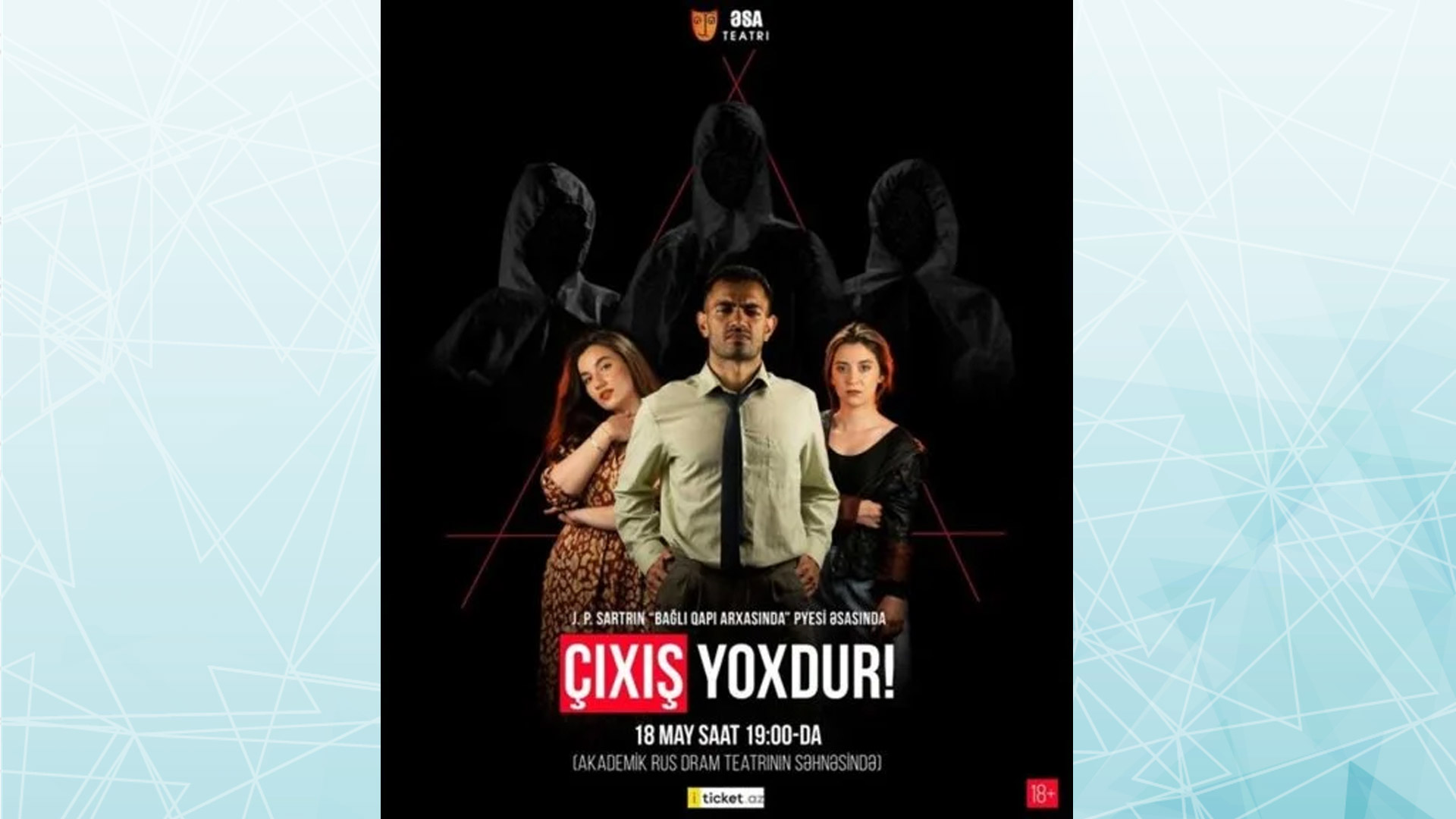 Bakıda Jan-Pol Sartrın “Bağlı qapı arxasında” əsəri əsasında hazırlanan “Çıxış yoxdur!” fəlsəfi dramı nümayiş olunacaq. Bu haqda BakuPlus.az Azərtac-a istinadən bu gün, 26 aprel tarixində xəbər verir.