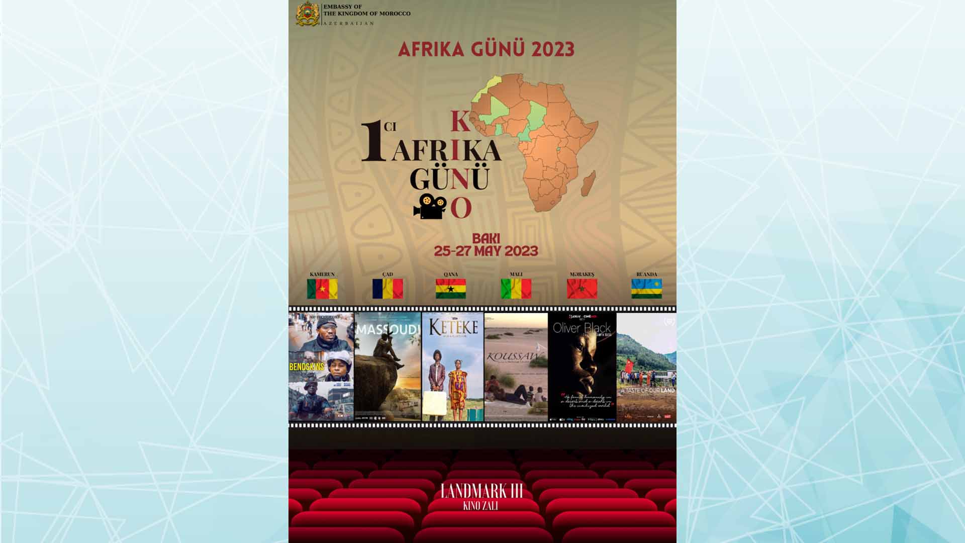 “Landmark”dakı kinozalda altı ölkəni - Kamerun, Çad, Qana, Mali, Mərakeş və Ruandanı təmsil edən altı mükafata layiq görülmüş film Azərbaycan ictimaiyyətinə və mediasına təqdim olunacaq.