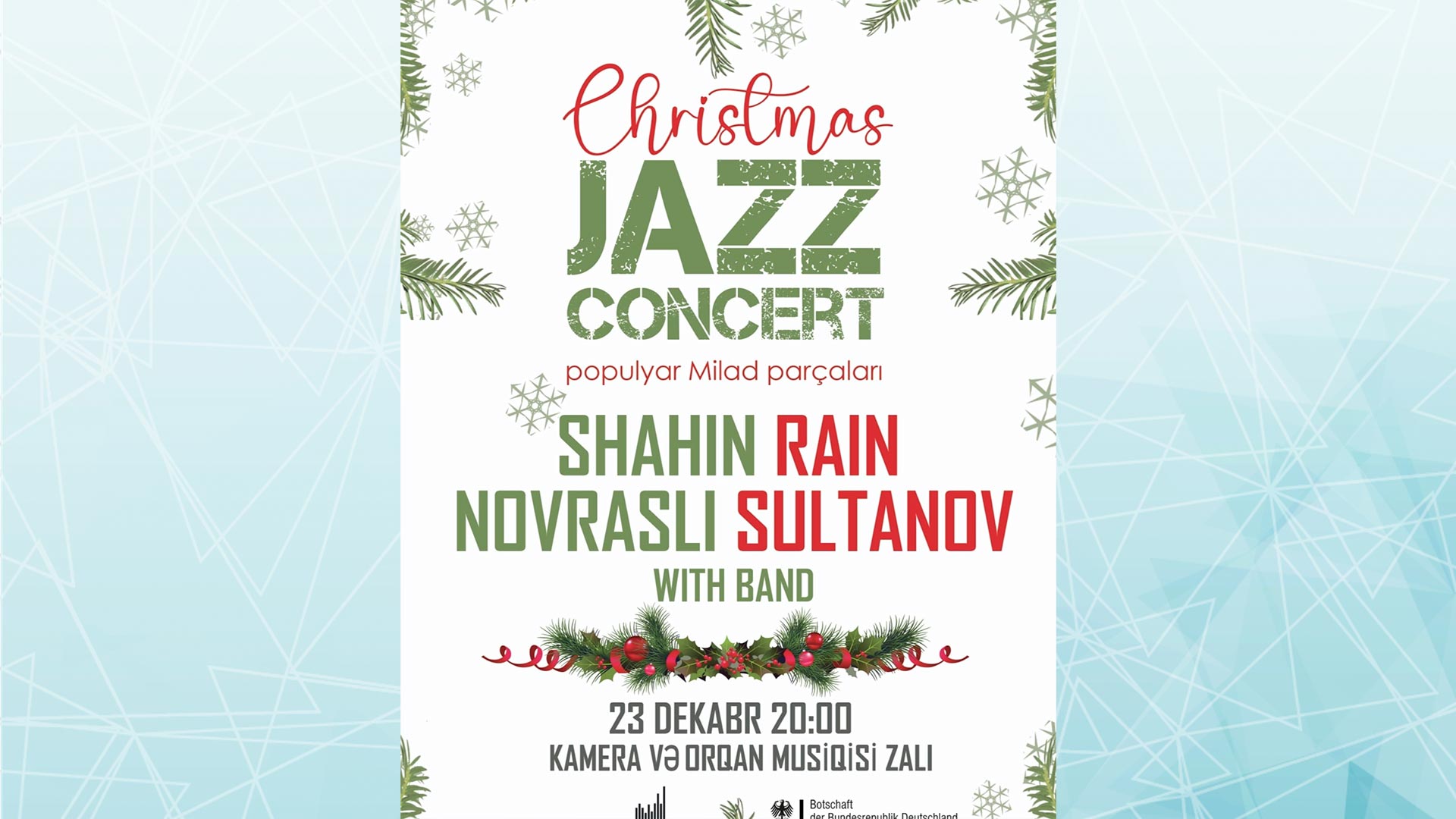 Bakının Kamera və Orqan Musiqisi zalında 23 dekabr 20:00-da “Christmass Jazz Concert” (Milad Caz konserti) baş tutacaq. Bu haqda bu gün, 15 dekabr tarixində Bakuplus.az məlumat verir.