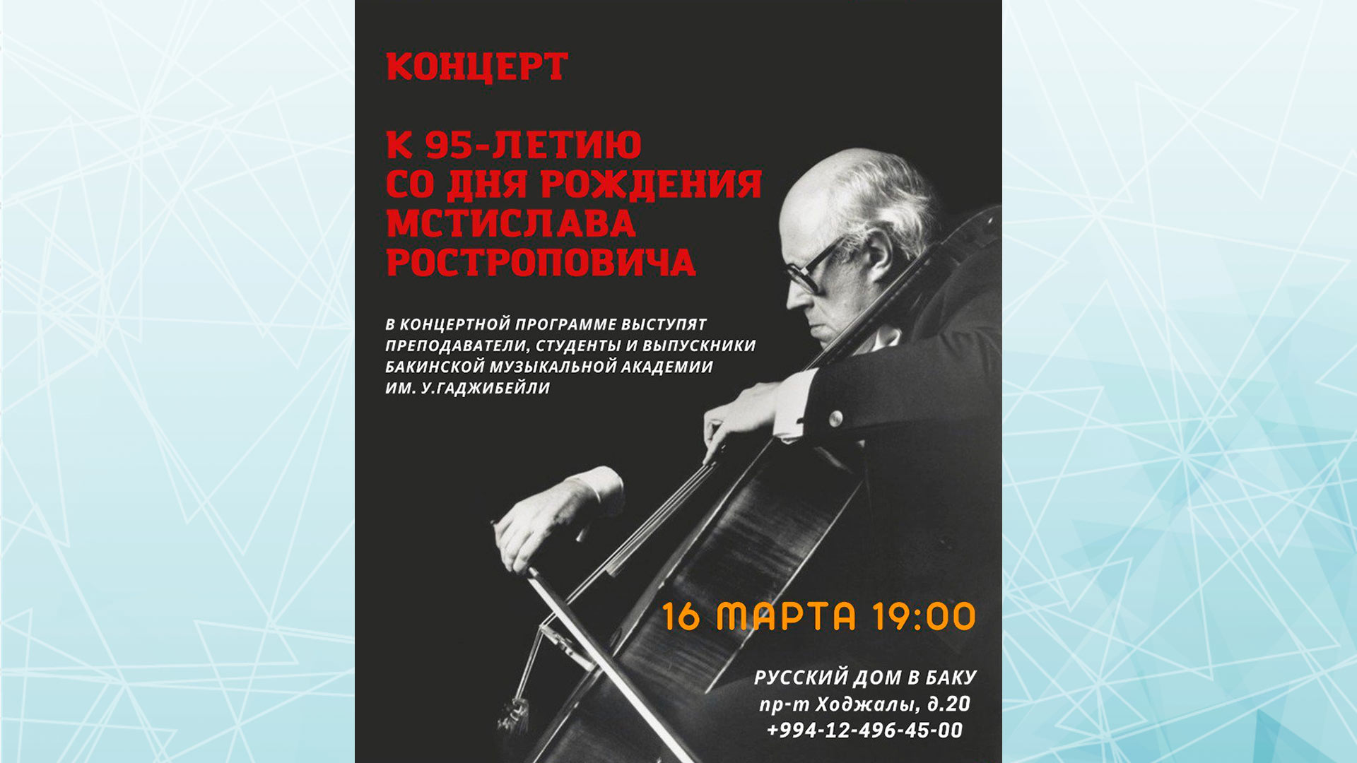 Görkəmli violonçel ifaçısı, pianoçu, dirijor, bəstəkar, pedaqoq, ictimai xadim, SSRİ Xalq artisti Mstislav Rostropoviçin 95 illik yubileyinə həsr olunmuş konsert martın 16-da Bakıdakı Rus Evində keçiriləcək. Bu haqda bu gün, 12 mart tarixində Bakuplus.az məlumat verir.