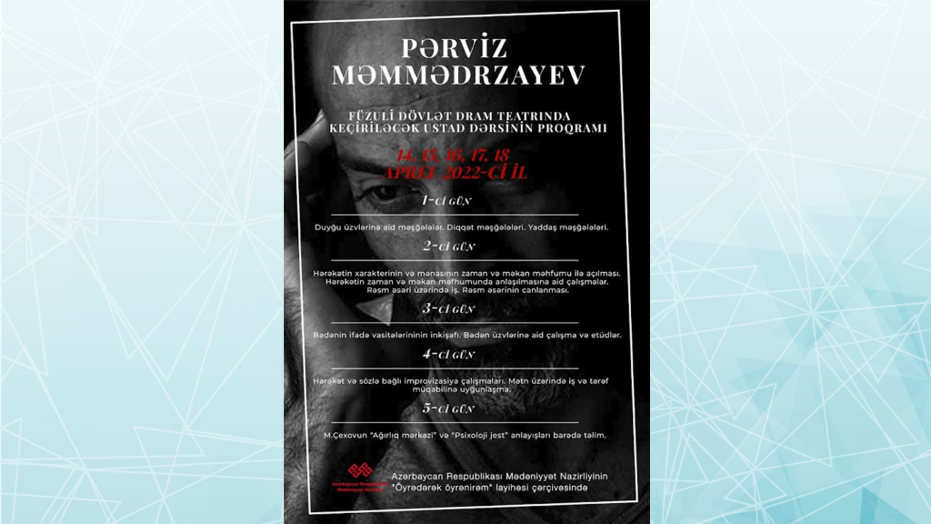 Azərbaycan Dövlət Akademik Musiqili Teatrının aktyoru, Xalq artisti Pərviz Məmmədrzayev aprel ayının 14-dən 18-dək Füzuli Dövlət Dram Teatrında ustad dərsləri keçəcək.