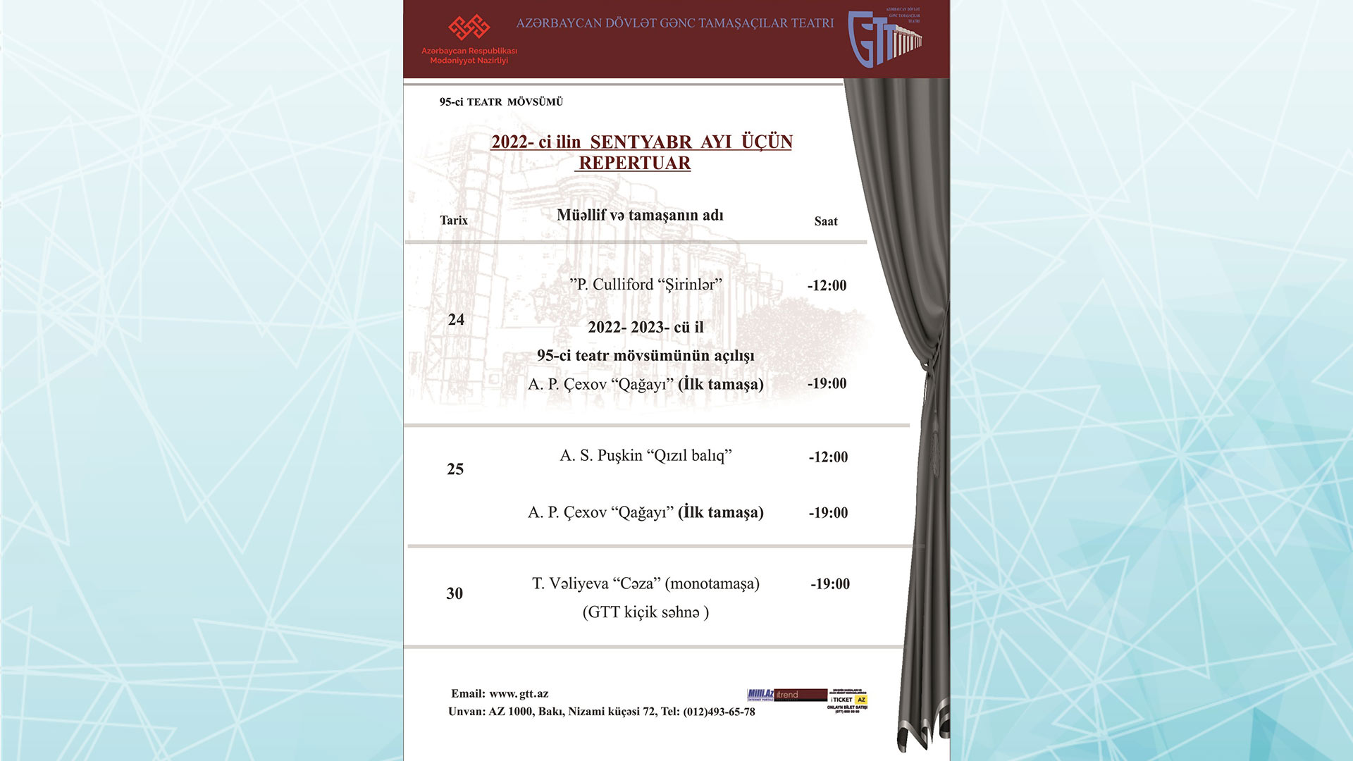 Azərbaycan Dövlət Gənc Tamaşaçılar Teatrının sentyabr ayı üçün repertuarı açıqlanıb. Bu haqda 8 sentyabr tarixində Bakuplus.az məlumat yayıb.
