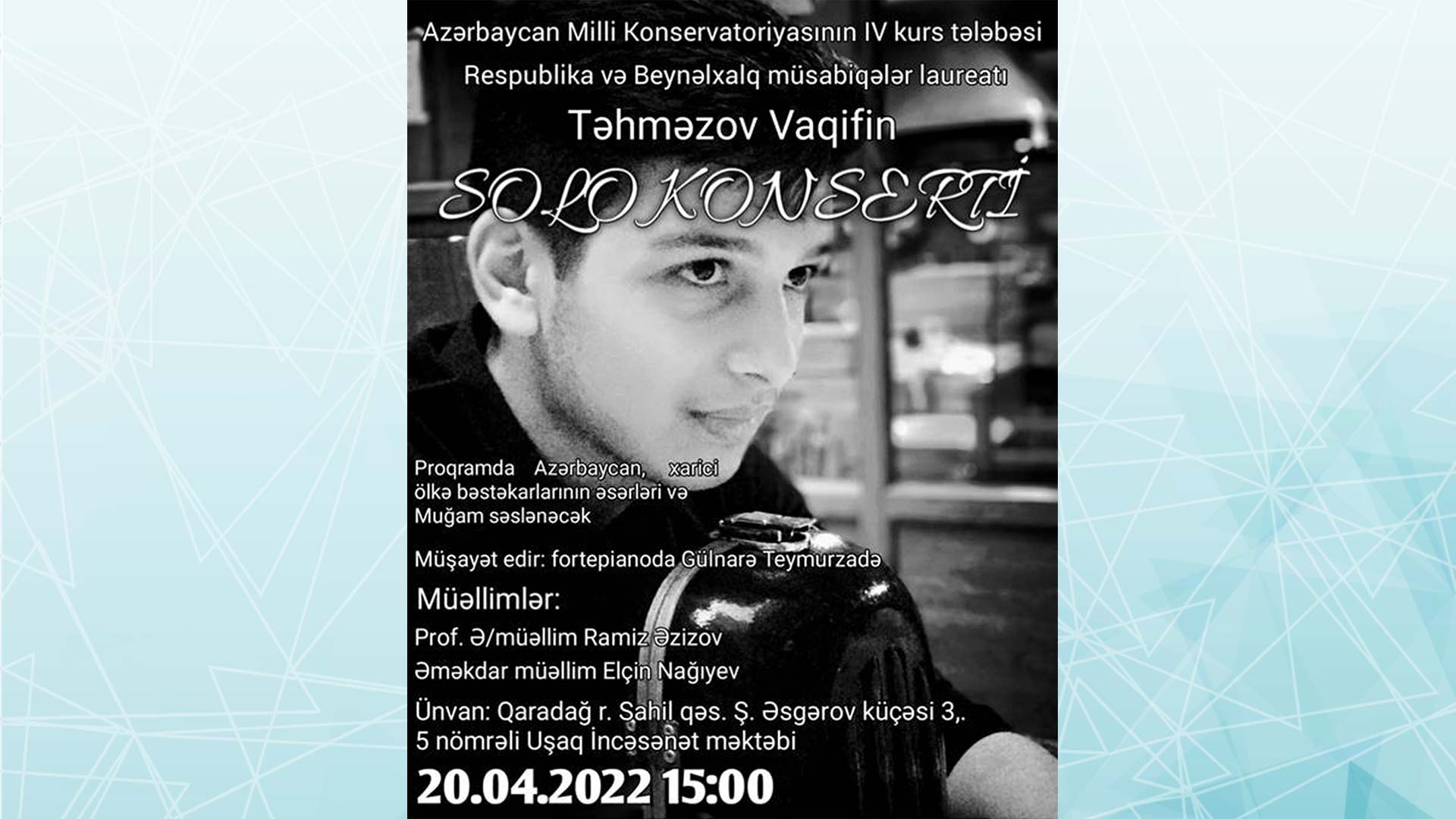 Azərbaycan Milli Konservatoriyasının IV kurs tələbəsi, Respublika və Beynəlxalq müsabiqələrin laureatı, məktəbin məzunu Vaqif Təhməzov 20 aprel saat 15:00-da 5 nömrəli uşaq incəsənət məktəbində solo konsert verəcək.