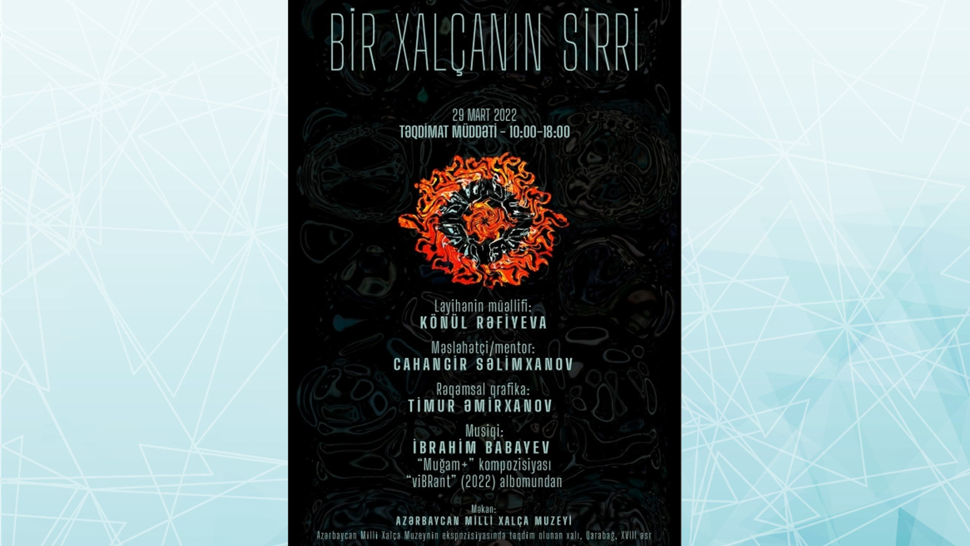 Martın 29-da keçiriləcək təqdimat mərasimi “Bir xalçanın sirri: muzey obyektlərinə yeni yanaşma” layihəsini əhatə edəcək. Ziyarətçilər saat 10:00-dan 18:00-dək ekspozisiyada yerləşdirilən videoinstalyasiya ilə tanış ola biləcəklər.