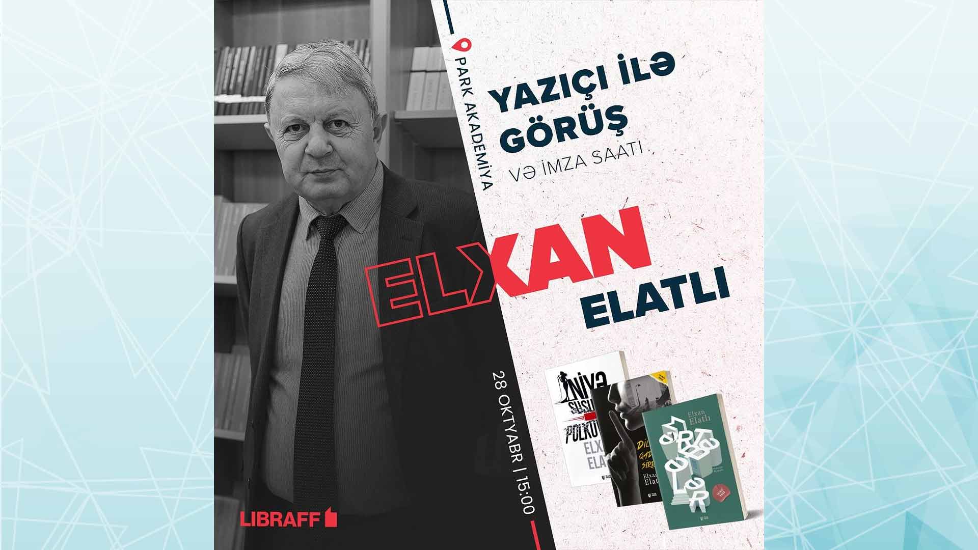 Bakıda okyabrın 28-də Elxan Elatlı ilə görüş və yeni nəşr olunan kitablarının təqdimatı keçiriləcək. Bu haqda bu gün, 24 oktyabr tarixində Bakuplus.az Libraff.az-a istinadən xəbər verir.