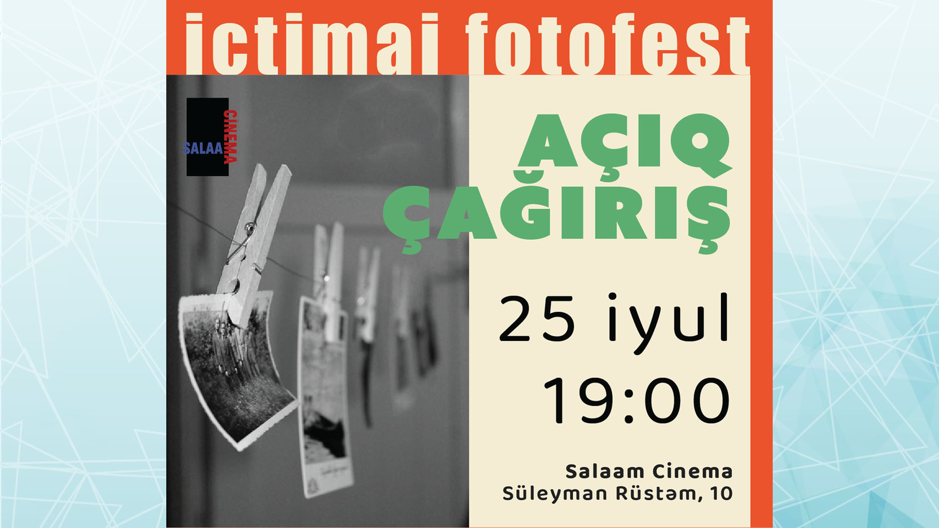 Salaam Cinema Baku açıq mədəniyyət məkanının bağında 25 iyul, saat 19:00-da ictimai-satış fotofestivalı keçiriləcək. Bu haqda bu gün, 22 iyul tarixində Bakuplus.az məlumat verir.
