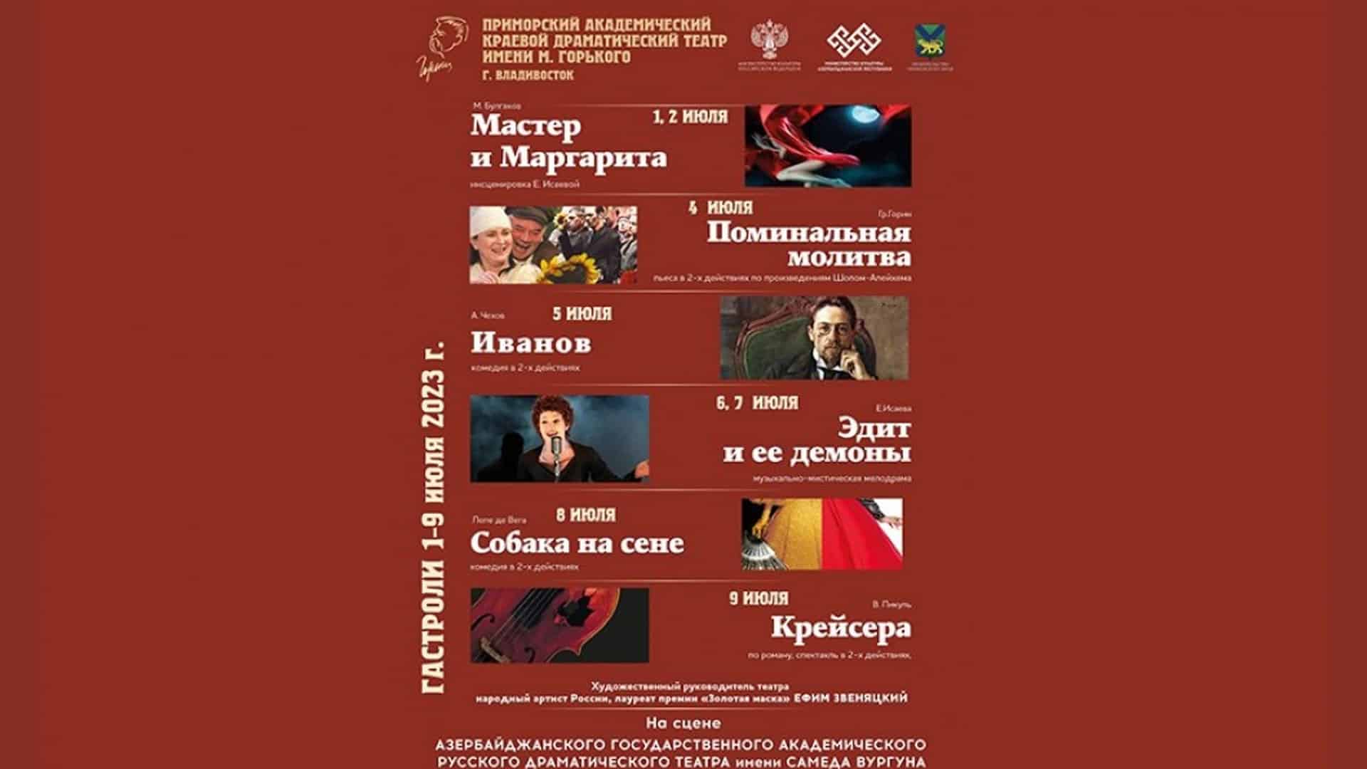 Rusiyanın Vladivostok şəhərində fəaliyyət göstərən Maksim Qorki adına Primorsk Akademik Vilayət Dram Teatrı iyulun 1-dən 9-dək Bakıda qastrolda olacaq. Bu haqda bu gün, 4 aprel tarixində Bakuplus.az Azərtac-a istinadən məlumat verir.