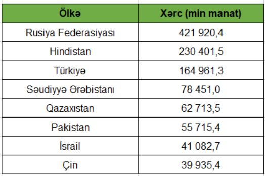 Siyahıda növbəti yerləri 78 milyon 451,0 min manatla Səudiyyə Ərəbistanı, 62 milyon 713,5 min manatla Qazaxıstan, 54 715,4 manatla Pakistan, 41 milyon 082,7 min manatla İsrail və 39 milyon 935,4 min manatla Çin tutub.