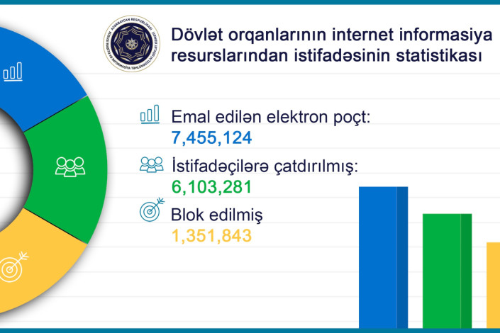 XRİTDX-in daimi nəzarəti altında fəaliyyət göstərən dövlət elektron poçt xidməti üzrə bu ilin 7 ayı ərzində 7,455,124 elektron poçt emal olunub. Onlardan 6,103,281-i təhlükəsiz olduğundan istifadəçilərə çatdırılıb, 1,351,843-ü isə zərərli tərkibli müəyyən edilərək bloklanıb.