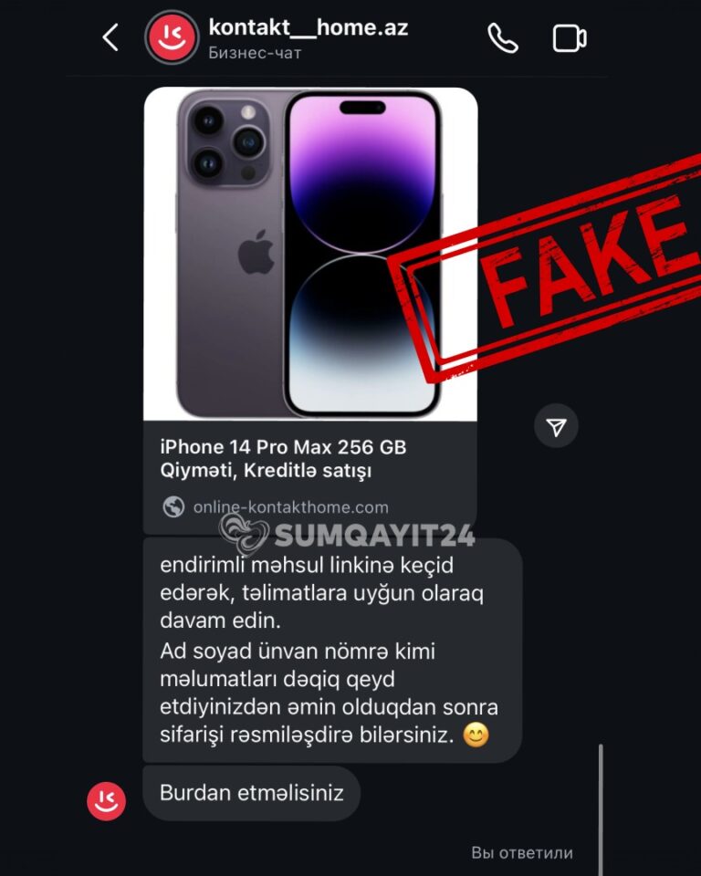 Sumqayıt24.az-a müraciət edən vətəndaşlar bildiriblər ki, naməlum şəxslər “İnstagram” sosial şəbəkəsində “kontakt__home.az” adlı səhifə açıblar. Onlara yazaraq məhsullarla maraqlanan insanlara “endirimli məhsulların linkini” göndərirlər və həmin saxta linkə daxil olan vətəndaşların kart məlumatlarını, minlərlə manat pulunu ələ keçirirlər.