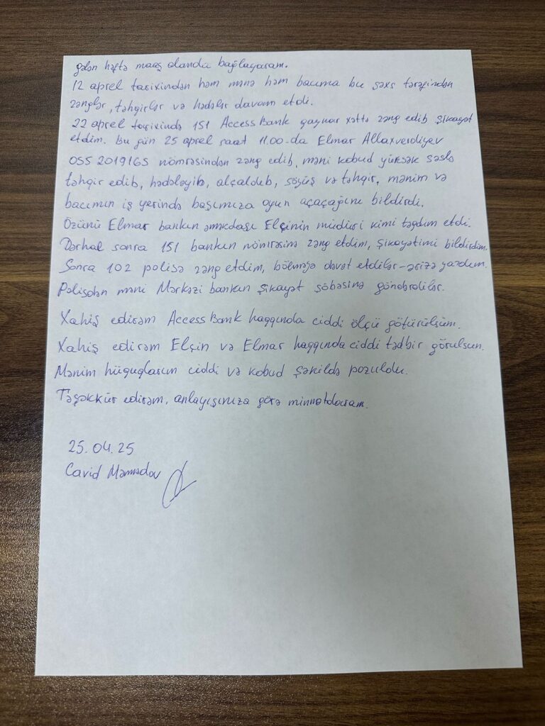 Bununla bağlı Bakuplus.az-a məlumat verən Cavid Məmmədov bildirib ki, bankın Elçin Sərkərov adlı əməkdaşı ona və bacısına hədə-qorxu gəlib, onları hədələyib.