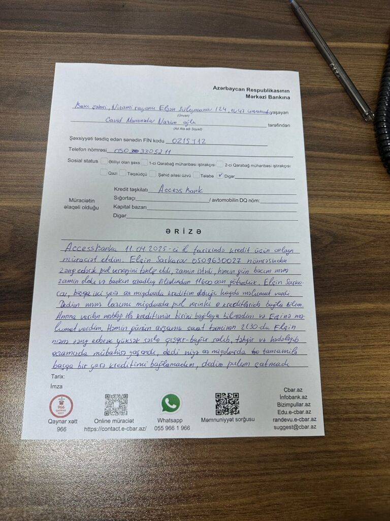 Şikayətçinin sözlərinə görə, aprel ayının 11-də adıçəkilən bankdan 11600 AZN pul götürüb, zamin isə bacısı olub: “Kredit götürmək istəyəndə Elçin Sərkərov bildirdi ki, başqa iki yerdə də az miqdarda kreditiniz var. Dedim lazımi məbləği verin ki, o borcları da bağlaya bilim. Vermədilər. Həmin gün kreditlərimdən birini bağladım, çeki göndərdim həmin adama. O biri kreditimin hamısını əldə qalan pulla bağlaya bilməyəcəyimi söylədim. Həmin günün axşamı saat 21.30-da Elçin Sərkərov zəng edib qışqır-bağır saldı, məni təhqir etdi, hədə-qorxu gəldi. Aramızda mübahisə yarandı. Elçin sonrakı günlərdə də mənə və bacıma zəng edib hədələdi, təhqir etdi. Bankın qaynar xəttinə zəng etdim, Elçin haqqında şikayətimi bildirdim. Bu gün mənə zəng vuran, özünü Elçinin müdiri kim təqdim edən Elmar Allahverdiyev adlı şəxs də mənimlə kobud danışdı, şəxsiyyətimi təhqir etdi, alçaltdı, bizim başımıza oyun açacağını söylədi”.
